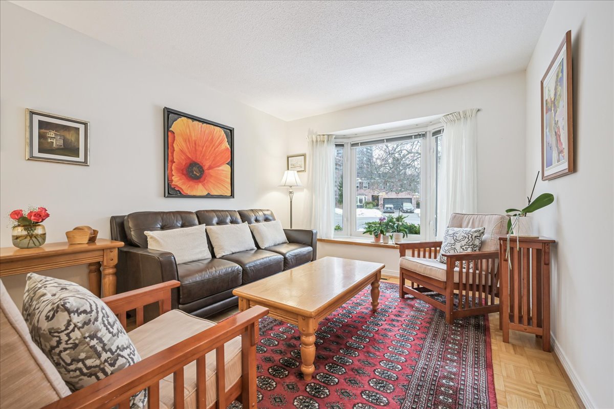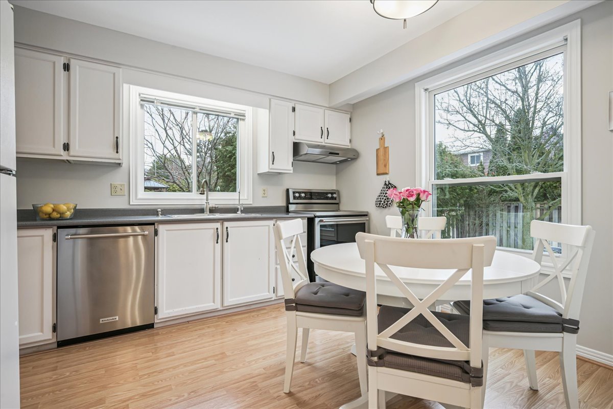 Nestled at the top of a quiet court in central Burlington, this beautifully maintained Monarch-built family home offers 3+1 bedrooms, 3.5 bathrooms and approx. 2,432 sq. ft. of finished living space including the basement. An ideal location for families and commuters alike, just an 8-minute walk to Tom Thomson Public School and minutes to downtown Burlington's shops, restaurants, waterfront, Spencer Smith Park, Brant Street Pier, Art Gallery of Burlington and Joseph Brant Hospital. Quick access to Burlington GO Station and Hwy 403, with Costco and Walmart close by.Curb appeal is exceptional with a double driveway, parking for four vehicles, attached double garage, interlocking stone curbing, manicured gardens and a welcoming stone walkway. The private backyard is a tranquil retreat featuring a spacious interlocking patio, mature trees, lush perennial gardens and a fruit-bearing pear tree-perfect for entertaining or enjoying quiet summer evenings.Inside, a striking oak staircase with black metal spindles anchors the foyer. The formal living room with parquet flooring flows through French doors into the warm family room with gas fireplace and walkout to the patio. The bright eat-in kitchen offers ample white cabinetry, stainless steel appliances (except fridge), updated laminate flooring and a generous breakfast area with treetop views. A separate dining room and convenient 2-piece bath complete the main level.Upstairs, hardwood flooring (2021) extends throughout the hallway, bedrooms and closets. The primary suite features a walk-in closet and private 3-piece ensuite, while two additional bedrooms share the main 4-piece bath. The finished lower level offers a versatile rec/media room with wide-plank laminate flooring (2022), a fourth bedroom or home office, and a full 3-piece bath. Numerous updates including roof shingles, windows (except patio door), front and rear doors, furnace and A/C complete this move-in ready home in a premium court location.