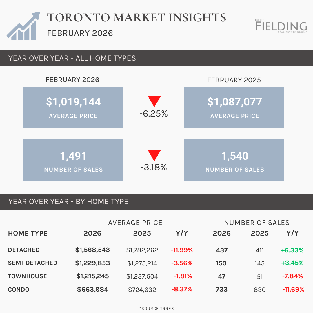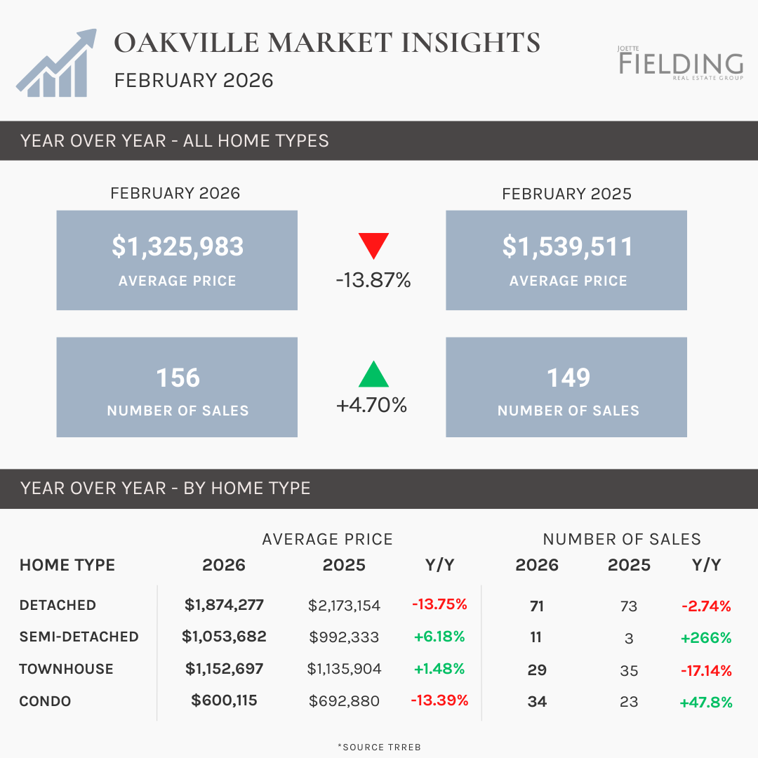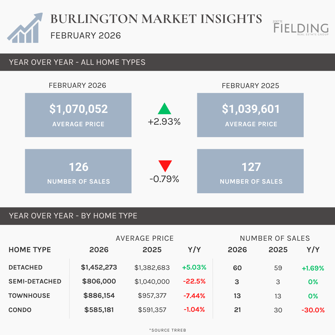 February 2026 showed mixed results across Toronto, Hamilton, Burlington, and Oakville. Burlington was the only market to see an increase in average price year-over-year, while prices declined in Hamilton, Oakville, and Toronto. Sales activity varied, with Hamilton seeing a large jump in transactions, Oakville a modest increase, and Burlington and Toronto remaining relatively stable. Overall, the market continues to rebalance as buyers remain cautious and price-sensitive.